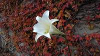 駐車場の紅葉の前に百合一輪