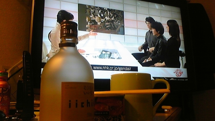 ホテルの机、『クローズアップ現代』のアンドロイド技術を鑑賞しつつ、焼酎を魚の缶詰を肴にして飲む。