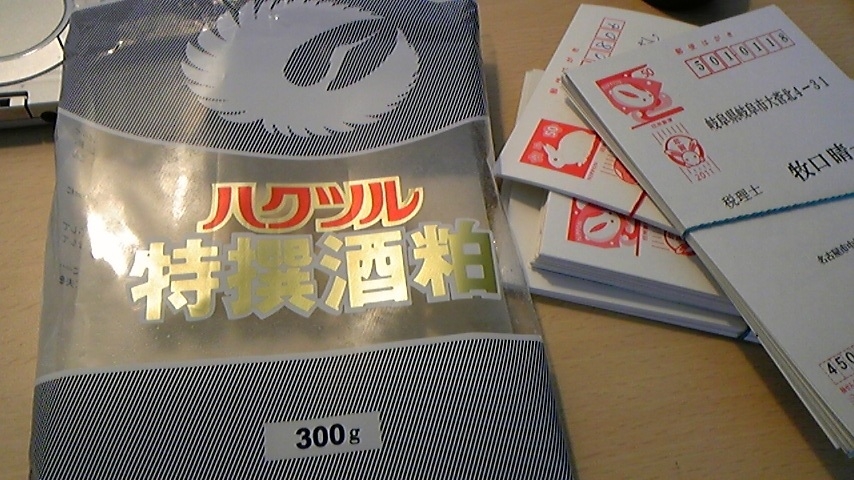 6日に近くのスーパーで購入した酒粕。ガッテンで栄養満点と報道されて品薄気味だ。横にまだ追われる年賀状追加に追われる様子が分る・・・
