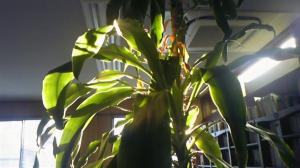 事務所の天井に届くまで育った、朝日を浴びている「青年の樹」。普段は社員がよく面倒を見てくれている。3連休の間、私は水やりは失念していて3日目に気付く始末だ。